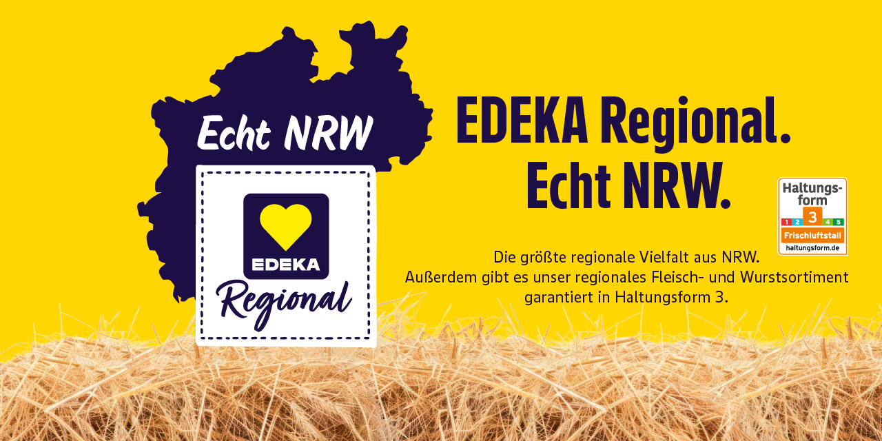 Saisonal, regional, frisch und einfach lecker – Dafür stehen die Produkte unserer Eigenmarke EDEKA Regional – Echt NRW. Unsere regionalen Produkte der Marke EDEKA Regional kommen aus NRW, die Marke steht für regionale Qualität, Frische und Vielfalt. Fleisch- und Wurstartikel der Marke EDEKA Regional bieten wir garantiert in Haltungsform 3 an.